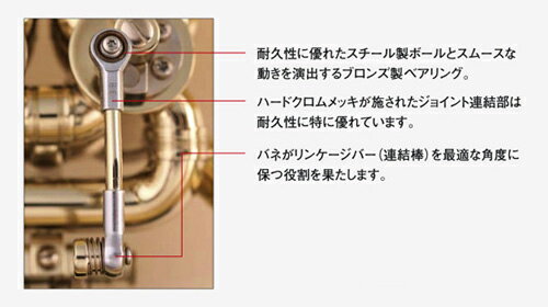 レバーアクションが快適なボールジョイントシステム、楽器の耐久性向上のための補強版、そして便利なウォーターキーを標準装備しています。